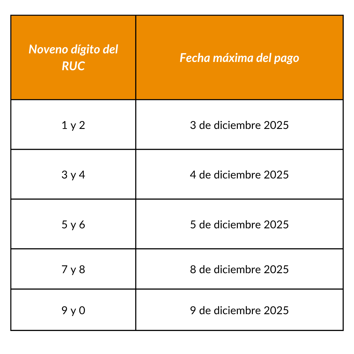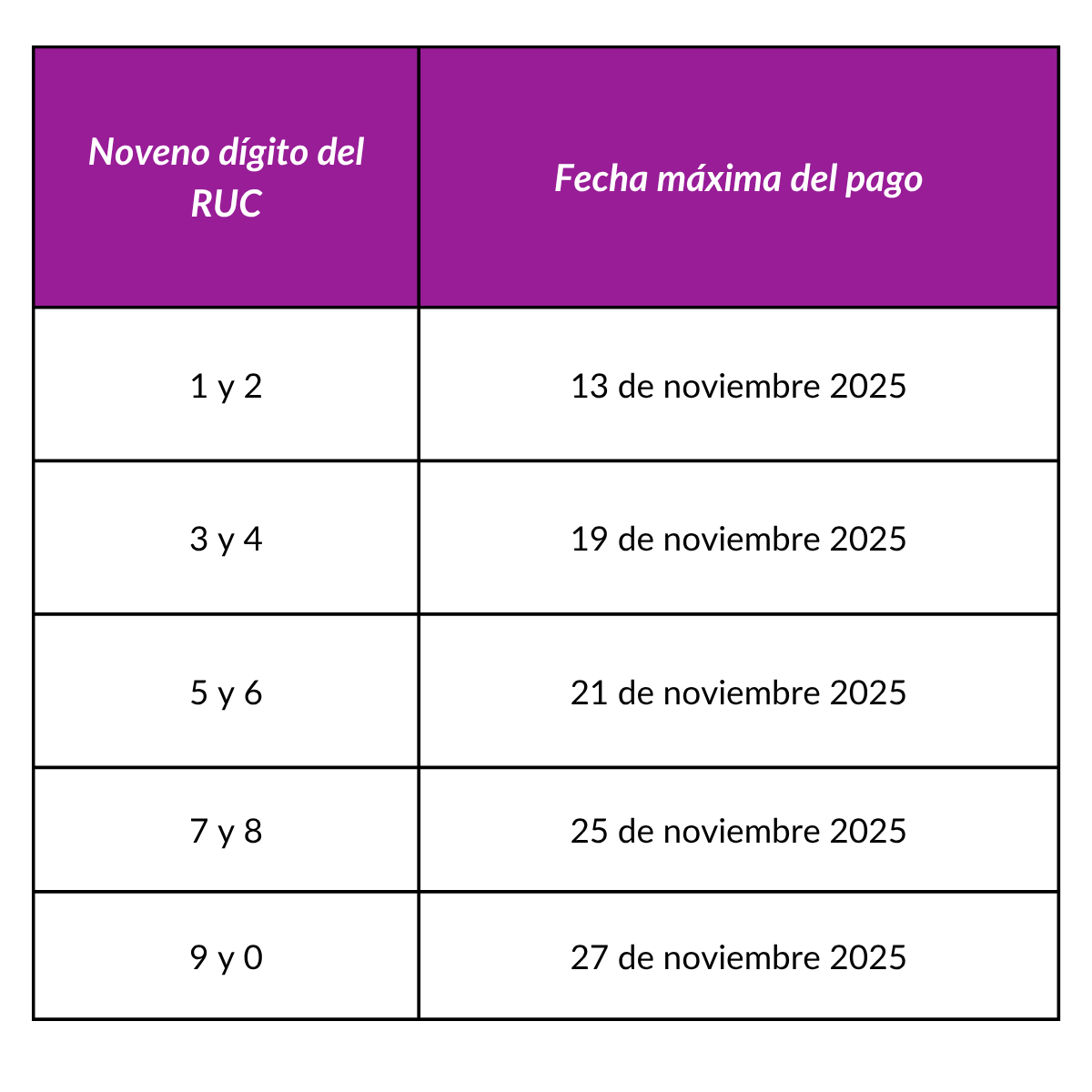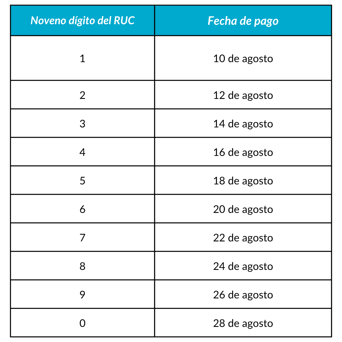 - Fechas de pago en agosto de cada año según noveno dígito RUC.