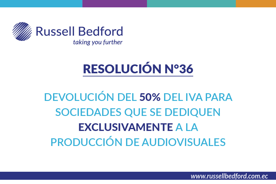 Mediante la resolución del SRI N° 36, publicada en el Registro Oficial N° 15, el 12 de agosto de 2019,  se establece que el SRI regula los procedimientos para la devolución del cincuenta por ciento (50%) del impuesto al valor agregado pagado por las sociedades que se dediquen exclusivamente a la producción de audiovisuales, producción de vídeos musicales, telenovelas, series, miniseries, reality shows, televisivas o en plataformas en internet o producciones cinematográficas, que efectúen sus rodajes en el Ecuador.