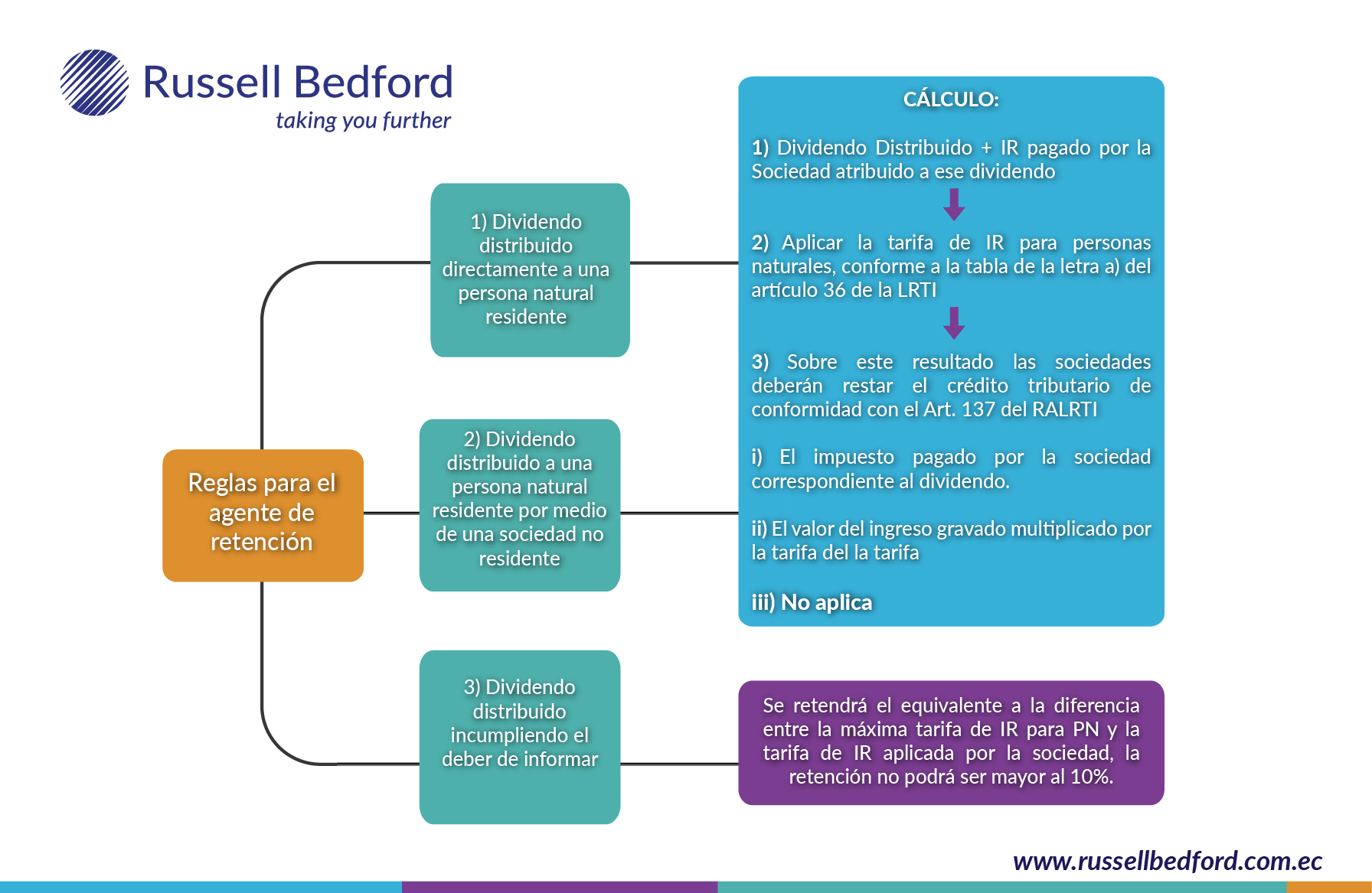 Normas para el Tratamiento Tributario en la Distribución de Dividendos. En la gráfica adjunta usted encontrará las reglas para el agente de retención. Manténgase actualizado en las disposiciones tributarias del Servicio de Rentas Internas SRI. En Russell Bedford Ecuador tenemos un equipo profesional capacitado para brindar asesoría contable y tributaria.